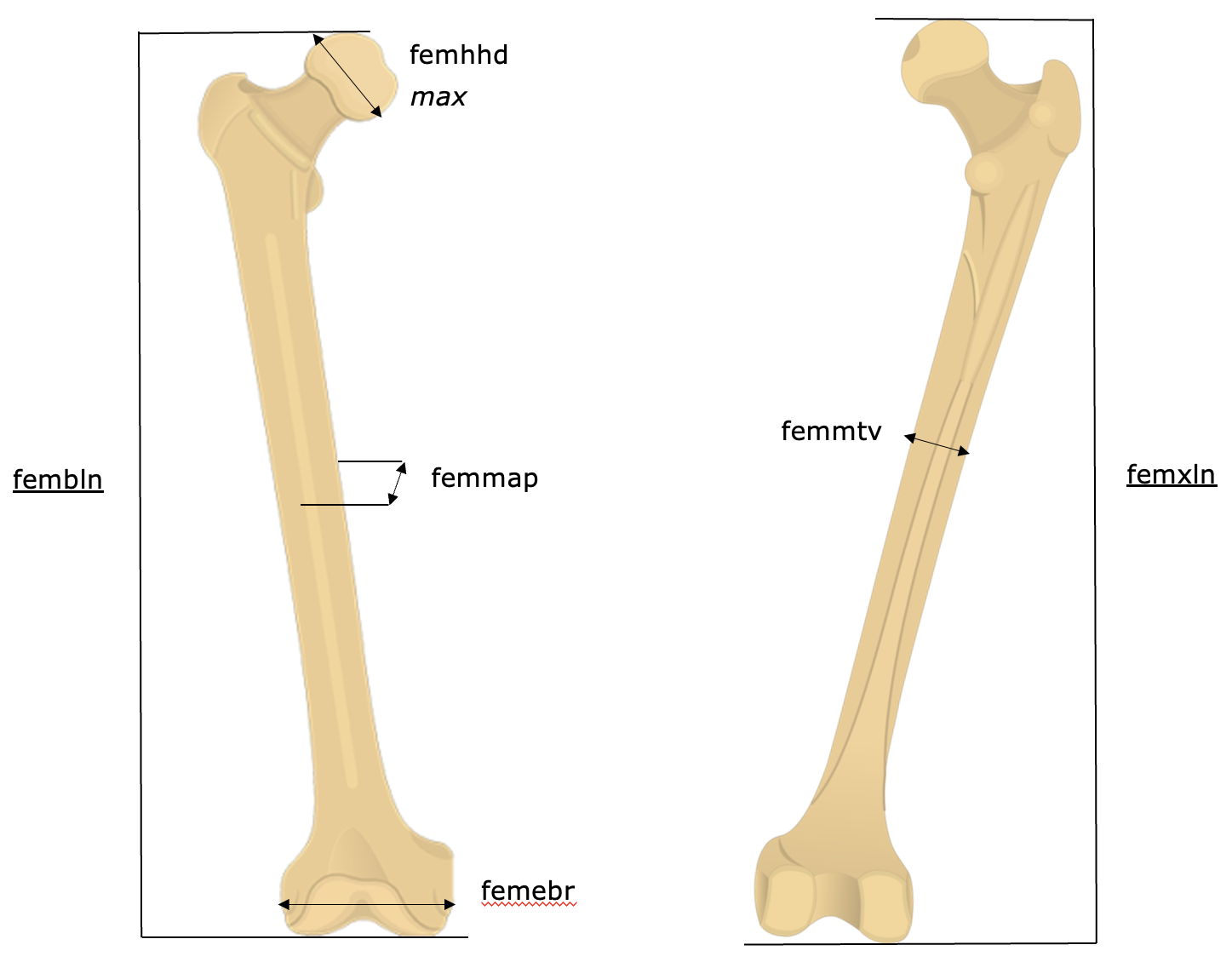 | Lower limb | Femur | femxln | Maximum length |